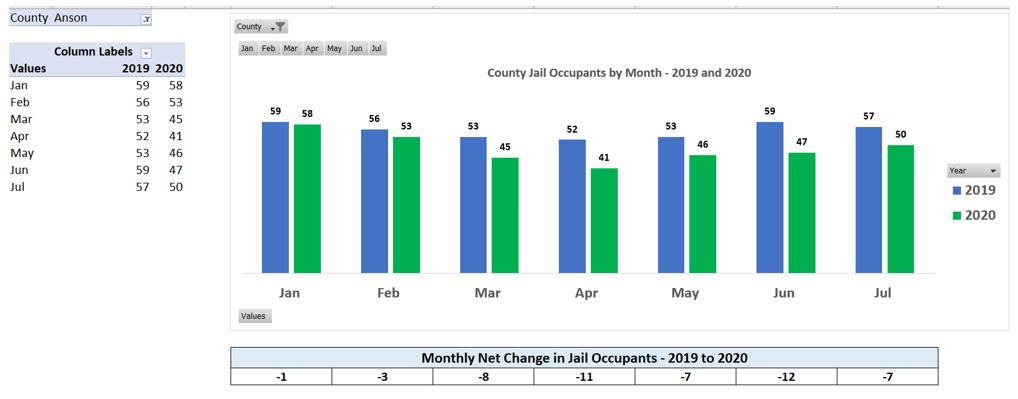 Finally, because we have fielded so many questions about county level jail populations during the COVID-19 period, we created a new tool allowing stakeholders to examine their local jail populations throughout the COVID-19 period. We present, for example, the graph for Anson County in Figure 2 below.
