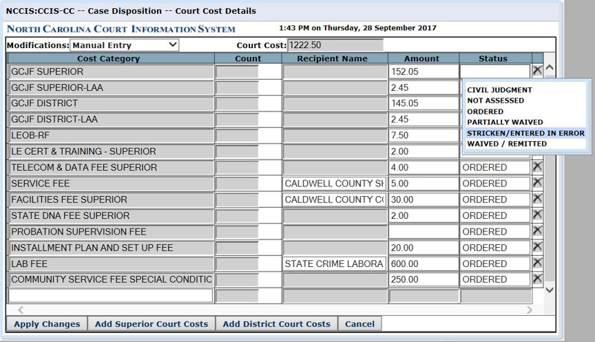 What does it mean to “not assess” a cost? The option to record a cost as not assessed was added to CCIS (the AOC’s computer system for criminal cases) in 2014, in response to concerns that “waived” had taken on a special meaning in 2011 with the introduction of the requirement for just cause findings. If the judge indicated that he or she did not want a particular cost to apply, but did not make the findings required to waive it, the “not assessed” code gave the clerk a more accurate way to memorialize what the judge actually did in the case.