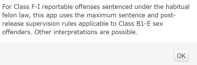 Finally, I should note that the analysis I applied in my blog post back in 2015 turns out based on Essick to have been incorrect. Moreover, I programmed that incorrect thinking into the Structured Sentencing Mobile Application available at ncsentencing.com. Under the rules we programmed into the app back in 2013, if you select a Class F–I felony, make it a sex crime, and enhance it under the habitual felon law, the following warning pops up: