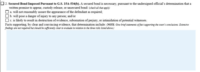 Written Findings Form. The Consent Order provides that when a secured bond is imposed, written findings must be made. The new policy operationalizes this by requiring completion of a new Written Findings for Secured Bond form. Among other things, the form requires the judicial official to state their reasons for imposing a secured bond (see Figure 1 below). It also requires the judicial official to find either that the defendant can afford to pay the bond or that the defendant cannot pay the bond or that ability to pay cannot be determined. If the judicial official finds that the defendant is unable to pay the bond or that ability to pay cannot be determined, imposition of a secured bond requires that the judicial official also find either that the bond is statutorily mandated or clear and convincing evidence that no other condition or combination of conditions can address concerns about the defendant’s appearance, preventing injury to persons, or preventing interference with the criminal proceeding (see Figure 2 below). A bond might be statutorily required, for example, when the defendant is arrested on an Order for Arrest after a failure to appear and the statutory bond doubling rules apply. Judicial officials also are required to provide a statement of facts supporting their decision.