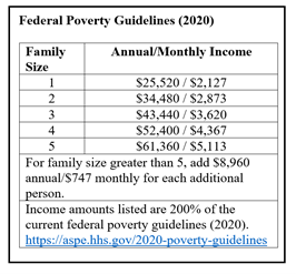 - has income at or below 200% of the federal poverty guidelines;
