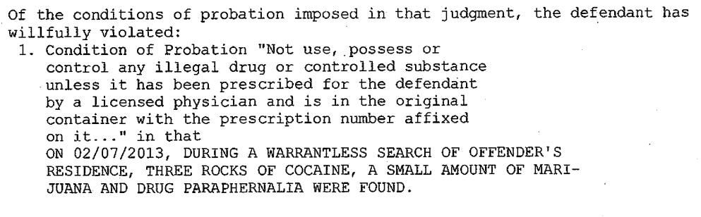 Another violation report, filed on March 27, 2013, alleged (among other things) a violation of the commit no criminal offense condition, referencing the defendant’s pending charges for possession of drug paraphernalia, possession of marijuana, and other crimes—charges that likely arose out of the probation search conducted on February 7 and mentioned in the February 8 violation report.