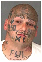 A suit and fake glasses are not going to help this defendant. Jonathan Schmidt of Lake Elsinore, California, was arrested for assault with a deadly weapon after allegedly being involved in a knife fight. His mug shot, below, suggests that his appearance may be a challenge for the defense. Sure, the defendant can wear a suit and fake glasses, but somehow, I don’t think that’s going to do the trick. Perhaps a makeup artist is required – recall this prior post, where I noted a case in which a makeup artist was provided at state expense to an indigent defendant.