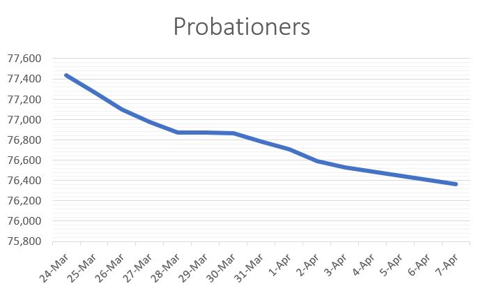 The number of probationers has declined as a result of the overall slowdown in new admissions through the court system along with normal expirations and early terminations.