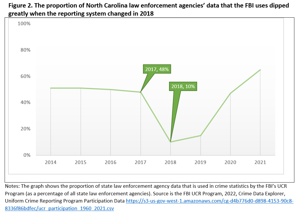 Some agencies were ready for the change, others were not. In 2018, when North Carolina switched to NIBRS, the proportion of law enforcement agencies’ data used by the FBI fell precipitously to 16% (Figure 2). Because it is unclear which agencies’ data were not reported or used, it is difficult to know how this drop in reporting in 2018 and 2019 impacted the reliability of the estimated crime rate for those years.